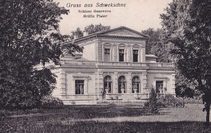 Reikėjo naujų rūmų aukštų svečių priėmimui ir pobūviams rengti. 1880 m. grafas Adomas Pliateris šalia senojo Švėkšnos dvaro pastatė grakščius, nedidelius ampyro stiliaus rūmus, kuriuos pavadino žmonos vardu – villa "Genowefa".